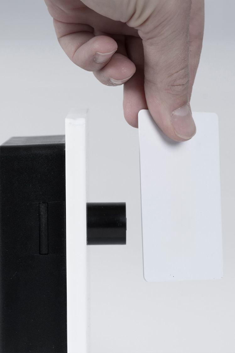 - Operação sem contato: Para destravar, basta aproximar um cartão Mifare autorizado. Entre os recursos estão bloqueamento temporizado (CEM apenas) ou destravamento por proximidade do cartão.